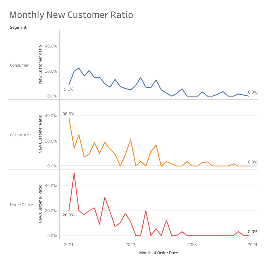 - 新規顧客の割合を線グラフの最初と最後に表示する。