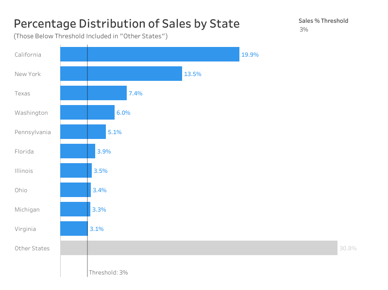 - 売上割合の閾値パラメータを作成し、閾値未満の州を全て「Other States」とし、その売上割合を表示する。