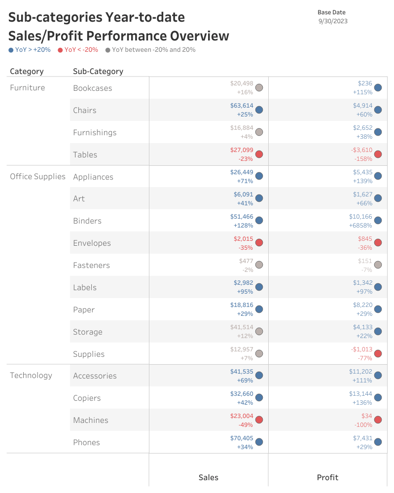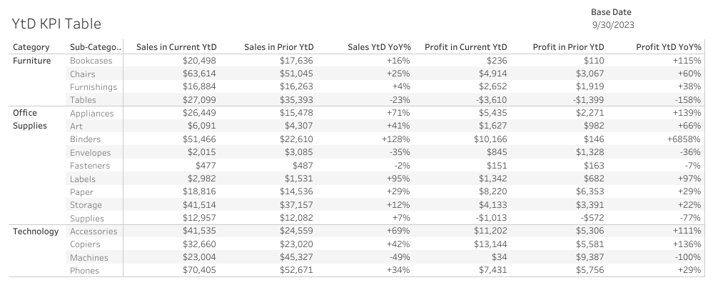 例えば上記では、2023年9月30日を基準日とした、年初来(YtD: year-to-date)の売上と利益、前年同日までの数字、そして前年比成長率(YoY%: year-over-year %)をサブカテゴリごとに表示しています。
