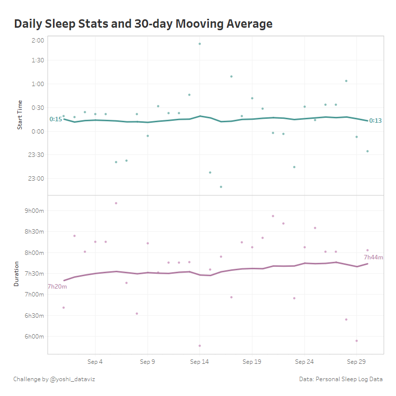 - 各日付(ここでは起床時刻の日付を使用)について、入眠時刻と睡眠時刻およびそれぞれの30日移動平均を可視化する。