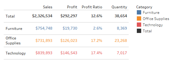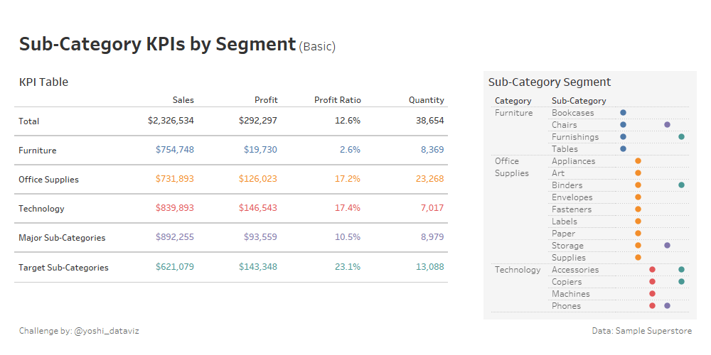 SuperstoreのサブカテゴリごとのKPIについて、以下のようにカテゴリごとに分類および集計して可視化していました。