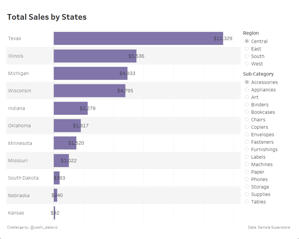 ただし表示される棒グラフが多くなるにつれて、ラベルが小さく表示されるようにすること。- East地域でフィルターし、Copiers (6州) と Paper (14州) を比較すると、ラベルの大きさが変化しているかどうか確認しやすいと思います。