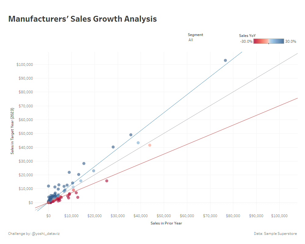 - 対角線だけでなく、売上成長率が+30%および-30%となる位置を示す線もあわせて表示する。